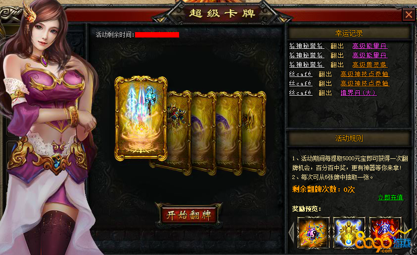 【活动内容】:活动期间,每提取5000元宝,即可获得一次翻牌机会,翻牌百分百中奖,每次翻牌从六张牌中抽取一张,获得珍稀道具。