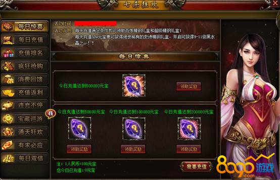 【活动说明】:每日充值10000、50000、100000、200000元宝的天数累计达到1、2、3、4、5天即可领取丰厚的奖励!