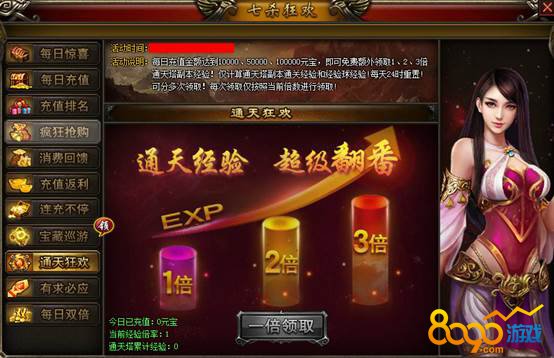 【活动说明】:每日充值金额达到10000、50000、100000元宝,即可免费额外领取1、2、3倍通天塔副本经验!仅计算通天塔副本通关经验和经验球经验!每天24时重置!可分多次领取!每天领取仅按照当前倍数进行领取!