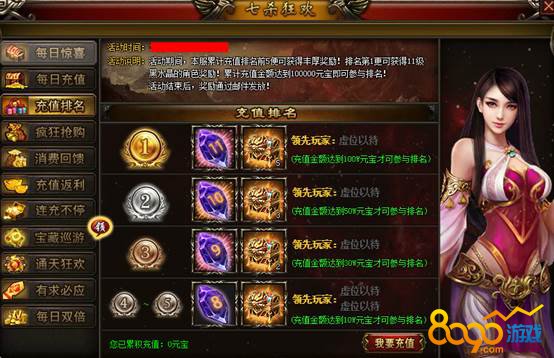 【活动说明】:活动期间,本服累计充值排名前5名便可获得丰厚奖励!排名第1更可获得11级黑水晶的奖励!累积充值100000元宝即可参与排名!活动结束后,奖励通过邮件发放!