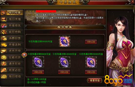 【活动说明】:每日充值10000、50000、100000、200000元宝的天数累计达到1、2、3、4、5天即可领取丰厚的奖励!