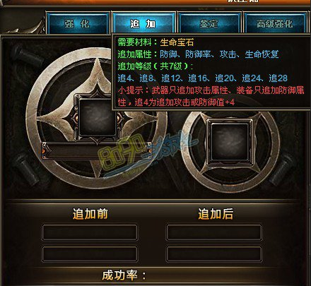 追加的属性不是随机属性,生命宝石是可以让装备追加多次,但是每次都有成功概率,如果失败可能会丢失属性的,追加等级越高,失败的概率就越大了。强化对比起追加会简单很多,强化只需要使用3种宝石来强化,同样是在铁匠铺里操作。