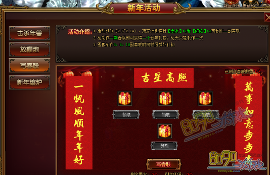 活动内容:活动期间,玩家消耗道具【墨水】*1和【红纸】*1可制作一副春联,每天只可制作一次。每制作一副春联就可以获得礼包【新年礼包·恭】,当累积制作3,6,9副时分别可获得【新年礼包·喜】,【新年礼包·发】,【新年礼包·财】。