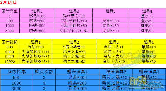活动内容:初一,初二,情人节,开启超值累充或累积消耗活动,2月5日到2月14日的其他日期也会不定时出现额外的充值惊喜活动,敬请玩家到时关注。