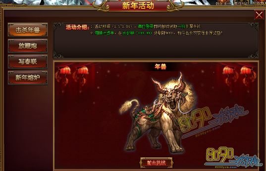 活动内容:活动期间,每天晚上19:30分,在冰风峡(130,30)处刷新新年BOSS【年兽】,击杀BOSS可获得丰厚奖励。