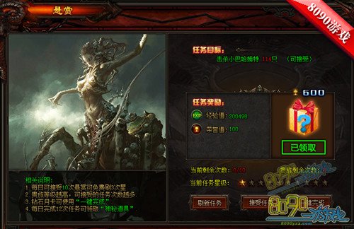 搜索"8090网页游戏"悬赏任务全新上线!完成任务拿奖励!经验奖励,荣誉点奖励,各种宝石等你拿!完成任务还可以获得神秘大奖!还在等什么,快来看看吧!8090英雄降临游戏里每天都可以领取悬赏任务,赶紧一起了解一下吧!