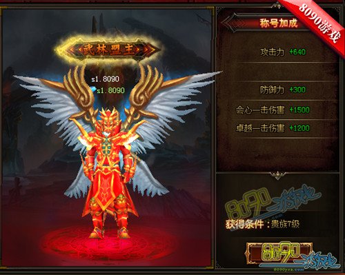 8090英雄降临中的武林盟主并不是武林霸主哦,而是贵族VIP7才能拥有的称号,只需要达到VIP7就可以自动领取了,并且可以与其他称号同时使用。武林盟主跟武林霸主是2个完全不同体系的称号,所以可以同时佩戴,VIP7已经是属于高级别的贵族了,其他的奖励也是非常丰厚的。武林盟主称号增加640攻击、300防御、会心一击1500、卓越一击1200,难得的增加4属性的称号。