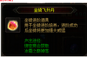 坐骑飞升丹产出途径:绑定商会获取、冰霜之巅掉落。