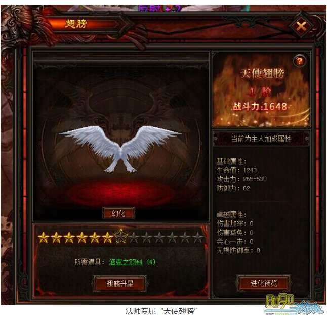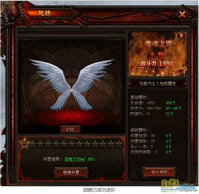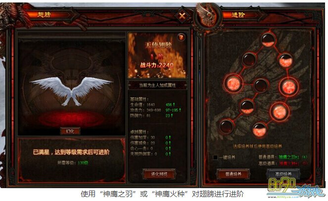 玩家需使用“洛克之羽”对自己的翅膀进行升星。当每阶星级升满后,可使用“神鹰之羽”或“神鹰火种”对翅膀进行进阶,进阶后,翅膀属性可或大幅提升。