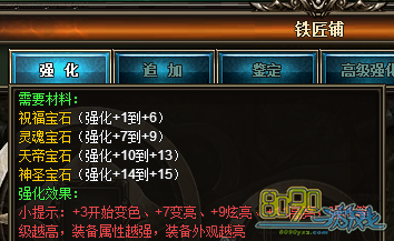 强化连锁的要求:必须需要强化到14和15的装备已经达到强化+13才能继续操作。当全身有一件以上强化13以上的装备的时候,强化连锁属性就激活了。