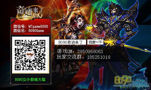 8090奇迹来了是一款忠实于奇迹精神的3D角色扮演类网页游戏。是全国第一款无插件3D网页游戏、全国第一款可以局部换装的网页游戏、全国第一款能海底游泳、天空飞翔战斗的网页游戏,同时也是全国第一款网页版奇迹!