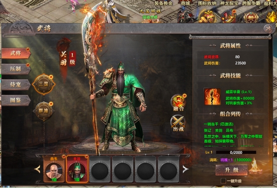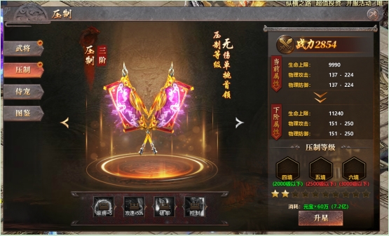 6、压制等级:升级武将系统中的压制,可压制更高等级的怪物,无伤刷怪效率大增。