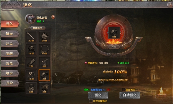 1、装备强化:已穿戴装备的部位可以强化,强化提升装备部位的锻造等级,获得属性成长。强化难度逐渐提升,高级强化有一定的失败率。