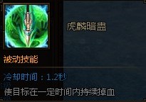 技能介绍:虎麟暗蛊,有几率触发,使目标在一定时间内持续掉血。