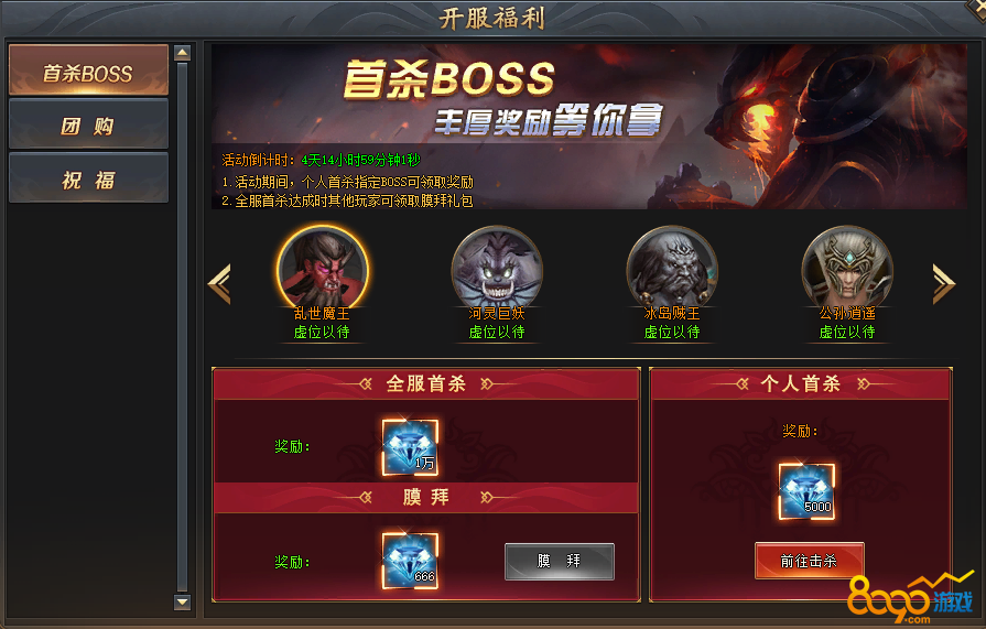 1.活动期间,个人首杀指定BOSS可领取奖励