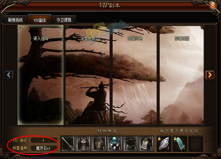 VIP副本需要玩家打开副本挑战界面。选择“VIP副本”标签。消耗VIP等级以及道具能进入不同的副本难度,除了高级装备之外,玩家在这里能获取大量的经验和金钱奖励。