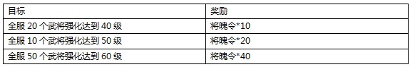 活动内容:活动期间,全服一定数量武将强化到一定等级,所有玩家均可领取奖励。