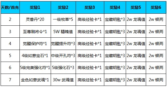 活动内容:新服开启第二天至第七天,每日充值任意金额,都可获得惊喜奖励!