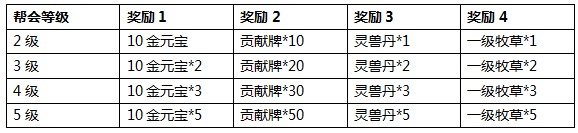 活动内容:新服开启前7天,玩家所在的帮派等级达到2级、3级、4级、5级,玩家均可领取对应等级的帮会奖励。