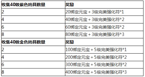 活动内容:玩家只需收集并装备上一定数量40级紫色、金色防具套装即可获得元宝、道具奖励。