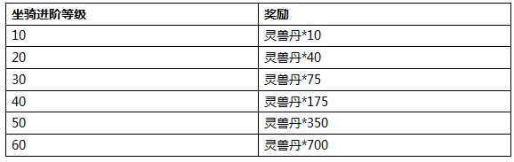 活动内容:活动期间,全服一定数量的坐骑进阶到一定阶数,所有玩家均可领取奖励。