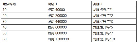 活动内容:活动时间内,将龙脉修炼到一定等级的玩家,将获得超值银两回馈。部分银两回馈奖励高达百分百!此活动只有一天的领奖时间,机不可失时不再来,你还等什么呢?