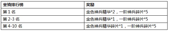 活动内容:以开服第3天23:00的坐骑排行榜为准,坐骑排名前十的玩家都可获得丰厚奖励。
