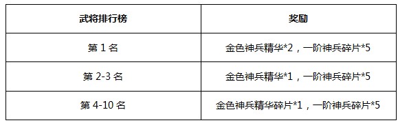 活动内容:以开服第二天23:00的武将排行榜为准,武将排行前10名的玩家都可获得丰厚奖励。