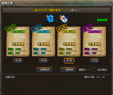 玩家30级能开启皇榜任务,在洛阳NPC太尉处领取任务,每人每天可以领取10次,可同时接取5个任务。黄帮任务能用皇榜令刷新任务,一般来说橙色任务是最好的,看到了一定要接的。