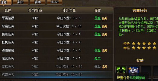 玩家在达到38级后就可以接锦囊任务了,锦囊任务一共分为20环,5个星别,每环击杀的怪为50个,刷星消耗1W的绑定银币,通过刷星可以获得更高的基础奖励。