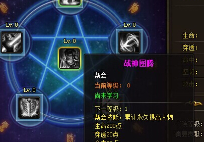 战神图腾是新出来的帮派技能,可以增加玩家10点攻击,12点坚韧,20点穿透,20点命中,200点永久生命,提高其他五个帮派技能1%的属性。