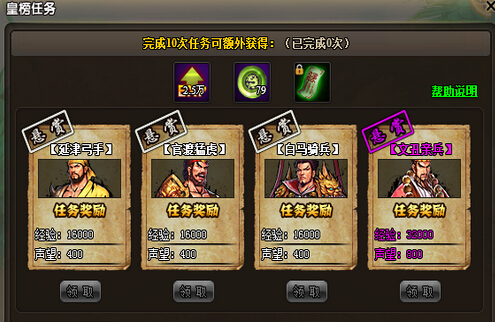 每人每天可领取10次奖励,每30分钟可获得免费刷新机会一次,将可获得大量经验和声望奖励。