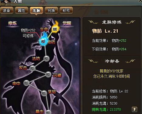 龙脉提升需要手动激活,每次激活提升需消耗一定的龙魂值和银两。八个龙脉提升都达到目标等级时,自动获得属性并激活相应称号。