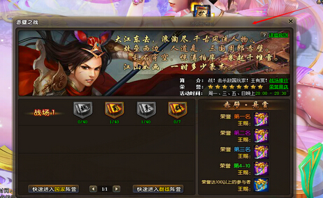 玩家等级30级后就能进入赤壁之战了,每周一、三、五、日20:00-20:30开启,每个战场的国家最多可进入40人。