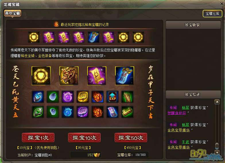 参与探宝,将有机会获得各种稀世珍宝,如:日行千里的“狂狮掠影”坐骑、进阶橙装必备的金色宝甲精华、觉醒保护符、3级宝石,强化装备的完美符等奖励。