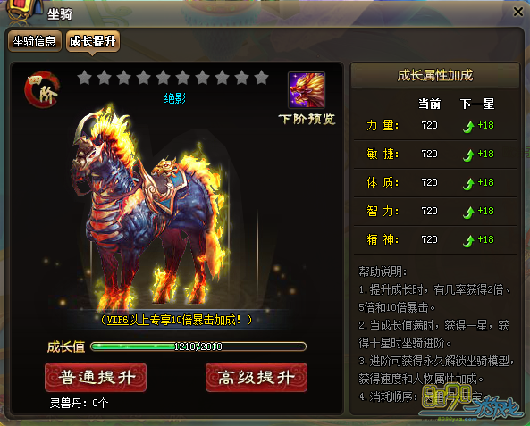 2. 当成长值满时,获得一星,获得十星时坐骑进阶。