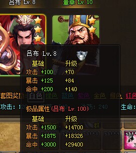 吕布,属性是增加100攻击、125暴击、200命中、200穿透。而吕布的极品属性更是可达1500+14700攻击以及1875+18326暴击以及3000+29400命中,是4星武将卡牌。