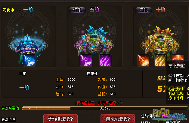 提升到相应的伙伴等级,会幻化新的伙伴造型,并获得新的技能。1阶玄龟有一个初级降低对方命中的技能;5阶玄龟变中级减命中,还多出一个20秒定身一次的技能;10阶玄龟比5阶的多出一个霸气技能,可以造成对面血量10%的伤害,60秒1次,且之前的技能都变成高级。