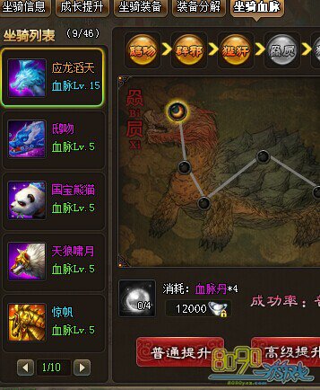 坐骑血脉觉醒需要消耗血脉丹,一共分为5层境界,每层有5星,点亮所有星可以自动进阶下层。这里需要注意的是拥有6个坐骑达到血脉Lv5,可以获得永久紫色坐骑,并且如果有一个坐骑达到血脉达到15级可以额外开启绚丽光环。血脉丹在每日的洛水龙宫中可以获得。