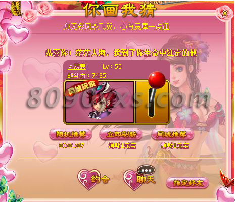 恭喜你!茫茫人海,找到了你生命中注定的他。这时你可以点击随机推荐,或者立即刷新,或者同城推荐,只要消耗1元宝。