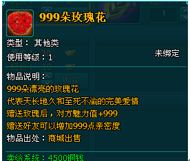 999朵漂亮的玫瑰花,代表天长地久和至死不渝的完美爱情,赠送玫瑰后,对方魅力值+999,赠送好友可以增加999点亲密度。物品出处:商城出售。卖给系统4500铜钱。