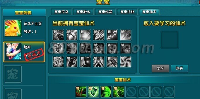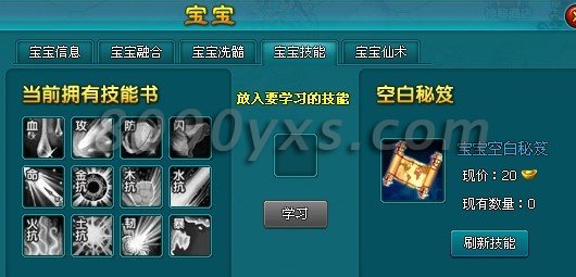 除了宝宝仙术,宝宝还有一种宝宝技能哦,可以通过商城购买空白秘笈进行刷新技能,这里的技能是直接增益于角色上的。不需要触发的,可以加很多战力哦。