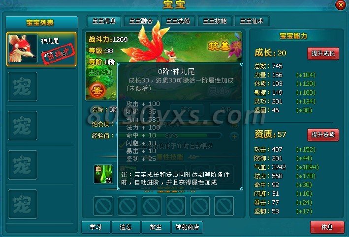 玩家可以一目了然的了解宝宝信息,宝宝融合,宝宝洗髓,宝宝技能,宝宝仙术。