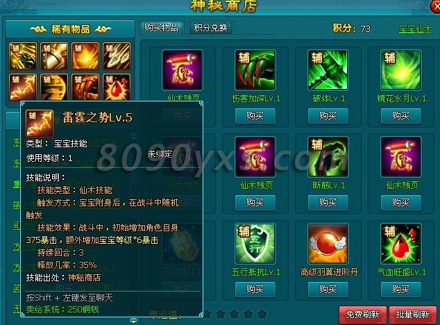 开放宝宝仙术后,游戏右上角就会出现神秘商店,每天可以在进行3次的免费刷新技能,不要忘记哦!