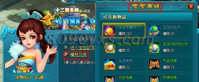 在宠物副本入口处可以用宠物副本里面拾取的蟠桃兑换宠物的相关物品哦,所以进入宠物副本就尽情的去采摘蟠桃吧。