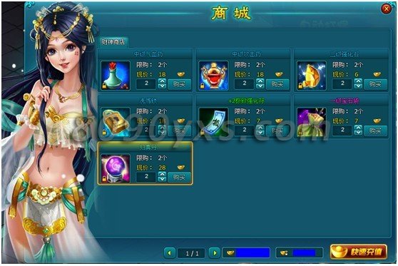 财神商店,中级气血药,中级攻击药,三级强化石,洗练纹,2级强化符,一级宝石袋,归真分。