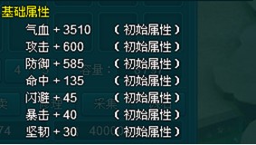 气血+3510,攻击+600,防御+585,命中+135,闪避+45,暴击+40,坚韧+30.