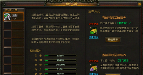 游戏中玩家可以通过主线任务获得坐骑,玩家可以骑上坐骑进行移动与战斗。坐骑提升玩家的移动速度,并且对玩家人物属性也具有加成。