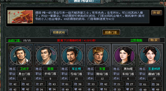 玩家们可以在酒馆中招募门客,可以招募到基础成长分别为:6,9,12,15的不同门客,在“武将”进入门客界面,选择对应职业的武将进行辅佐。