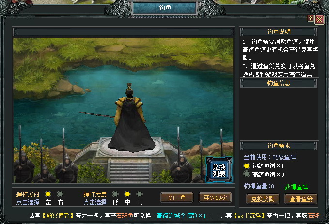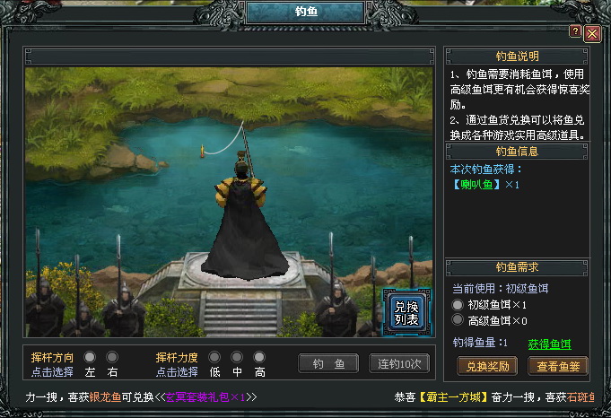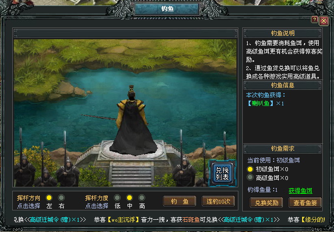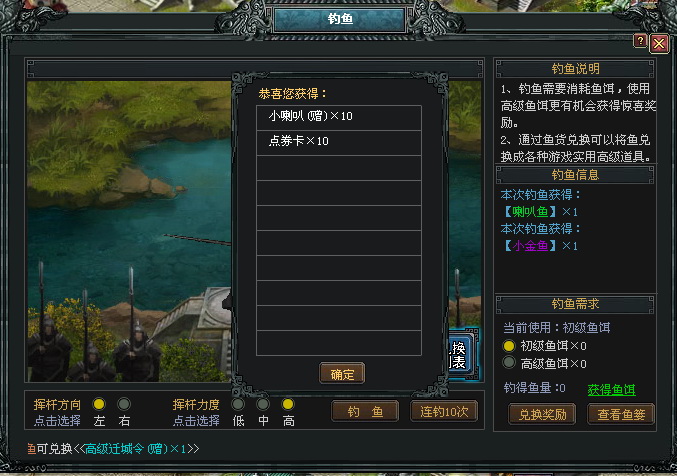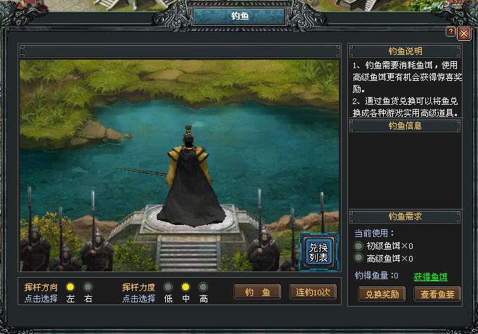 4、控制钓鱼的有挥杆方向、挥杆力度、使用的鱼饵类型。当然,点击钓鱼后,剩下最重要的也就是所谓运气;